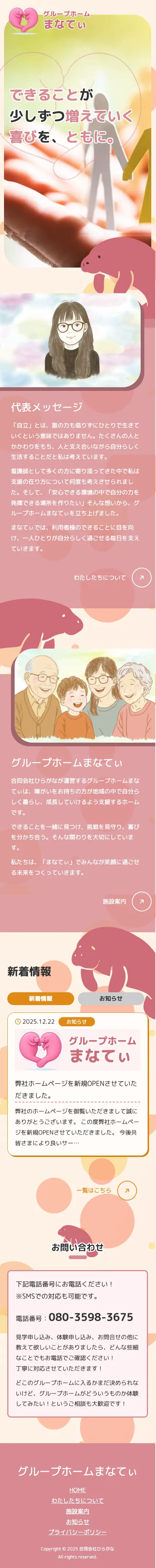 コーポレートサイト パソコン表示 スマホ表示 グループホームまなてぃ 様 URL https://hiragana-manatee.com/ 地域 埼玉県さいたま市 種別 コーポレートサイト 業種 介護・福祉 導入サービス ディレクション, コーディング, CMS構築 一覧へ