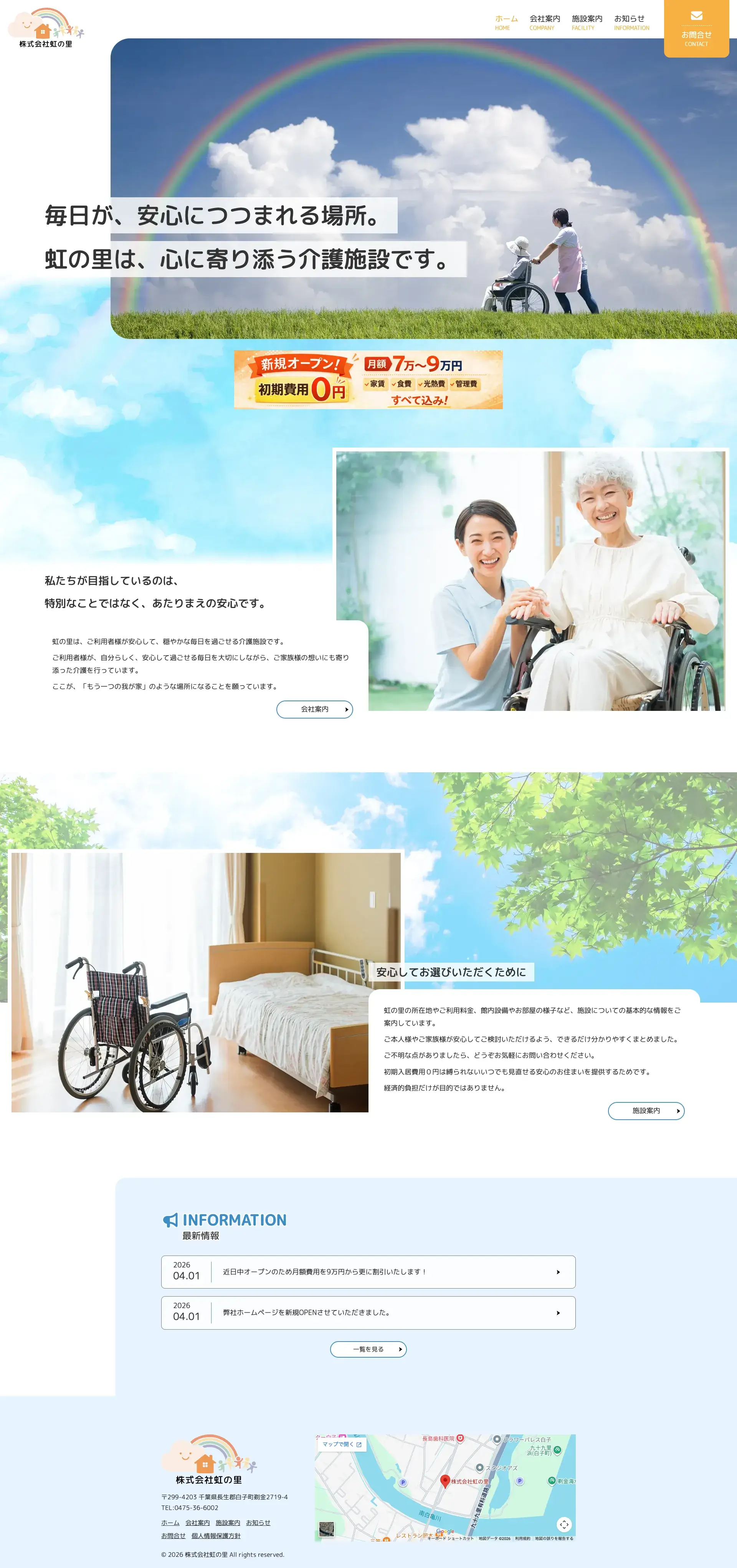コーポレートサイト パソコン表示 スマホ表示 株式会社虹の里 様 URL https://nijinosato-sirako.com/ 地域 千葉県長生郡 種別 コーポレートサイト 業種 介護・福祉 導入サービス ディレクション, コーディング, CMS構築, 管理サポートプラン 一覧へ